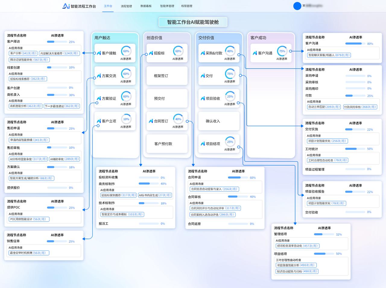 • 将业务流程以作战地图的形式进行可视化呈现,清晰展示流程的各个环节、节点之间的关系以及当前流程所处阶段